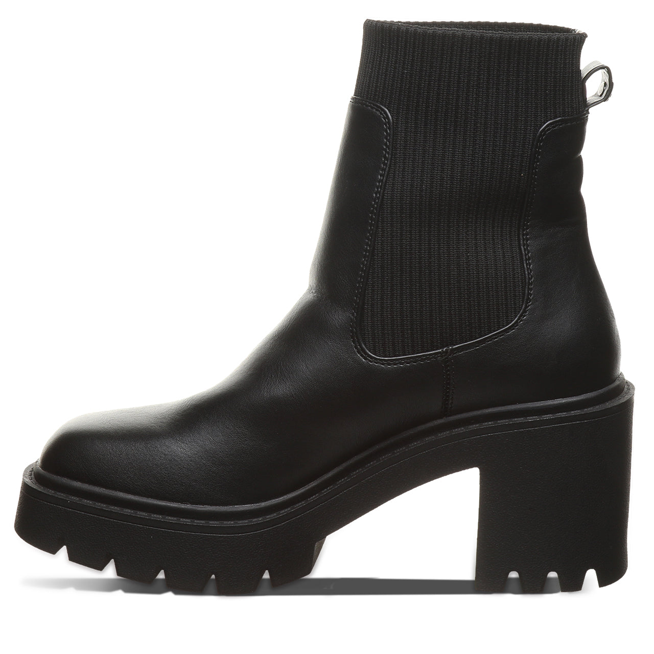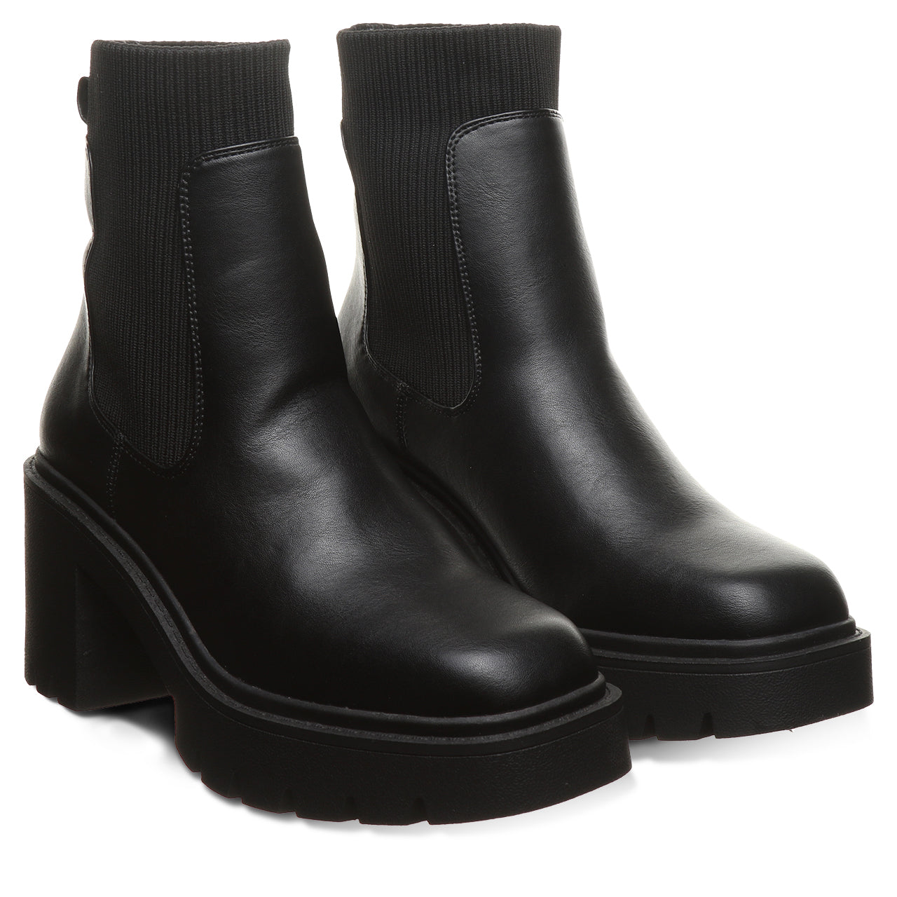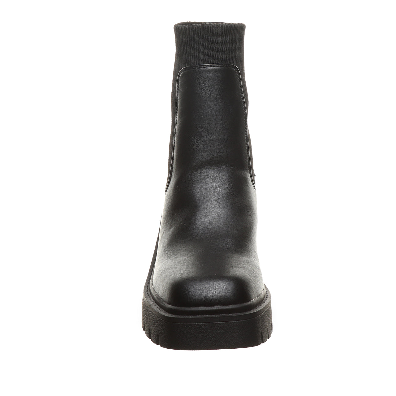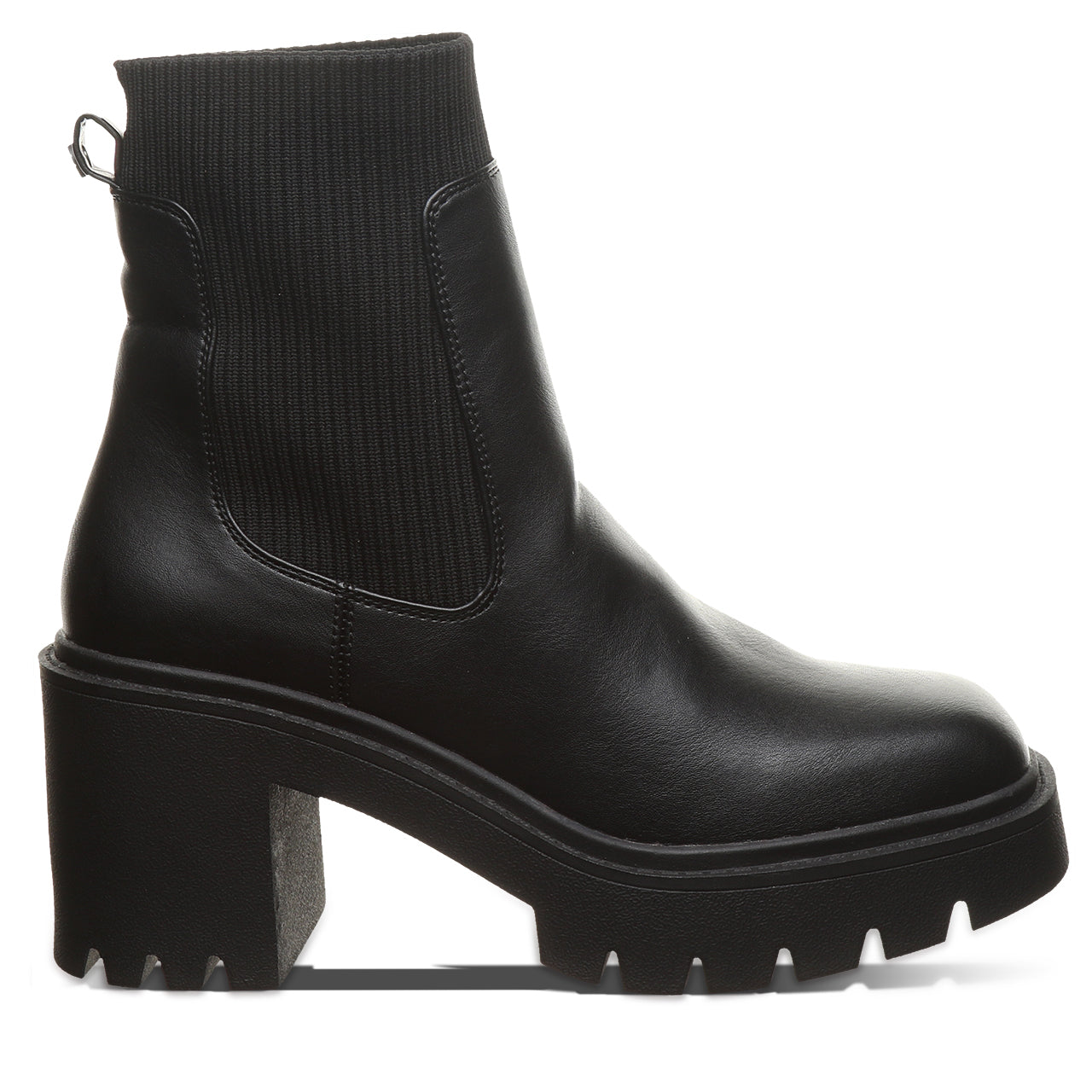 Meet your new go-to boot for bold, everyday style. This modern chelsea boot brings an edge to a timeless silhouette with a chunky block heel and statement lug sole. Crafted from sleek, smooth faux leather with stretchy side panels, it’s designed for easy on-and-off wear and a flexible, comfortable fit. The clean lines and minimalist shape make it effortlessly versatile - perfect for pairing with everything from jeans to dresses.