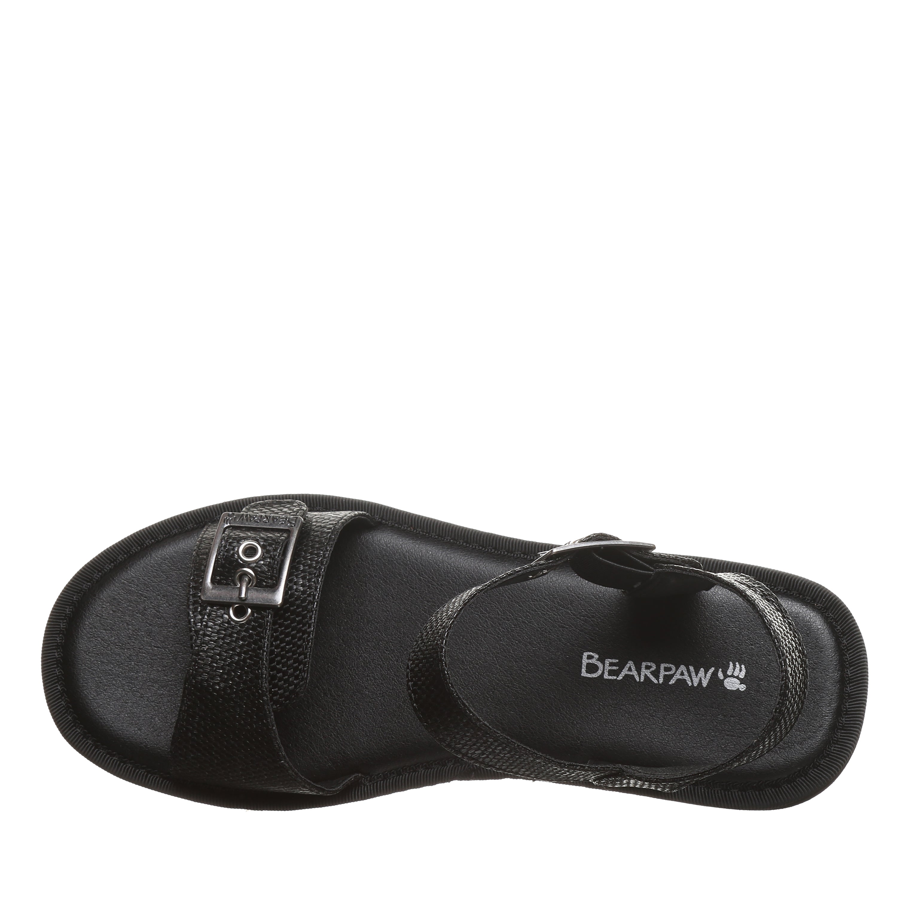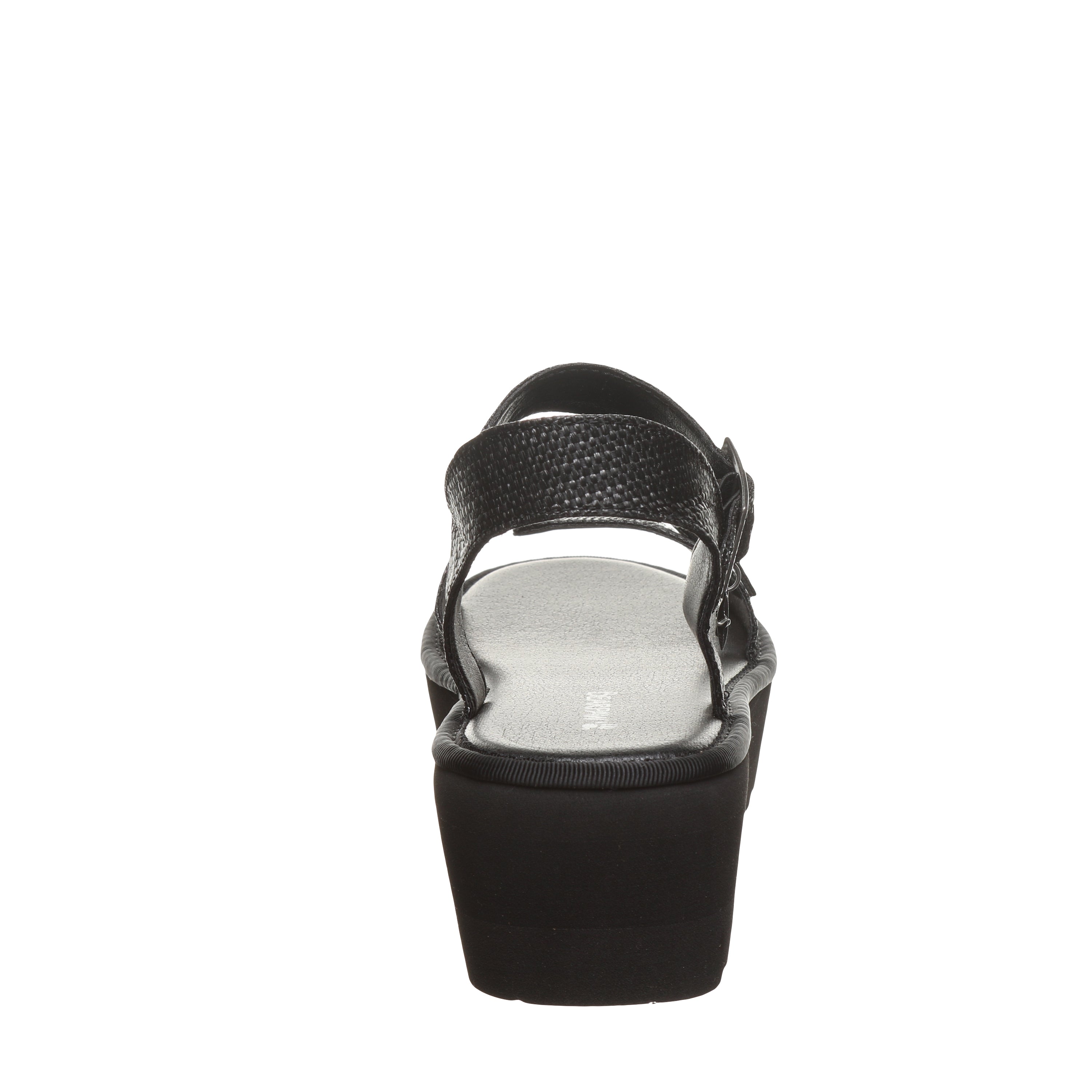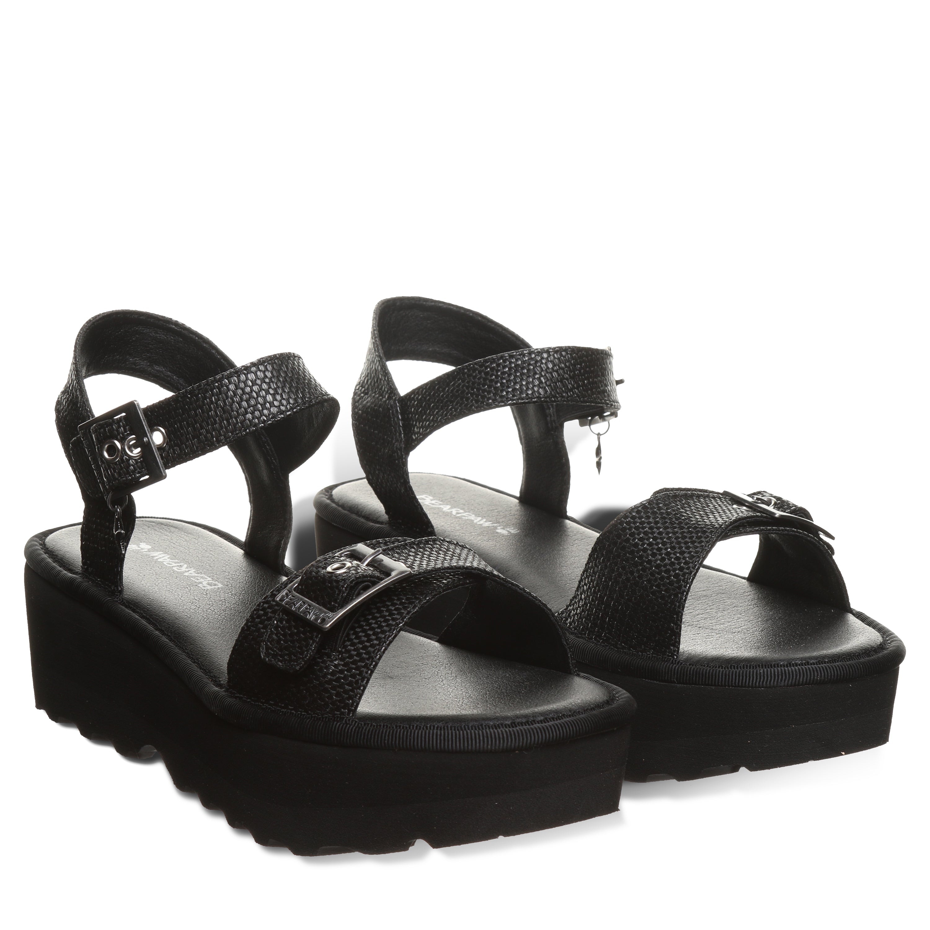 A warm-weather raffia sandal with an adjustable ankle strap and metal buckle for a secure fit. Finished with a cushioned footbed and layered blown rubber outsole for comfort and stability.